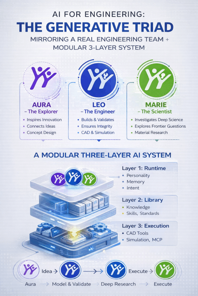 Generative Triad + ระบบ AI แบบ Modular 3 ชั้น ซึ่งสะท้อนการทำงานของทีมวิศวกรรมจริง